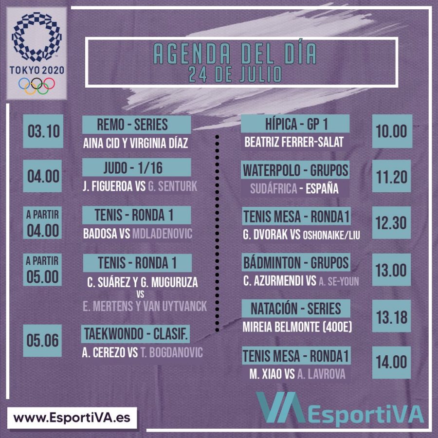 - Judo: Julia Figueroa estará presente sí o sí en los dieciseisavos de final a las 04.00 h, su participación en las rondas siguientes, octavos y cuartos, y a partir de las 10:00 h en la repesca y la pelea por las medallas, depende de su actuación en la ronda previa.