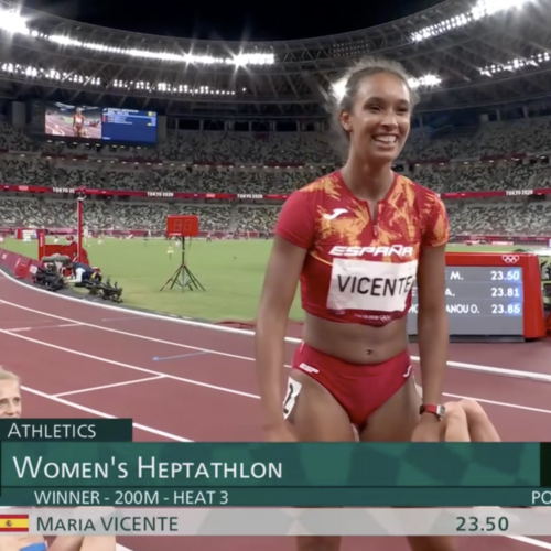 Buen primer día de María Vicente, que pese a no estar en puestos de diplomas olímpico, logra una buena remontada en la última prueba del día gracias a su victoria en los 200 metros, lo que le permite subir de la 21ª posición a la 12ª posición. Con solo 20 años, disputa sus primeros Juegos Olímpicos con gran margen de mejora. Estos han sido sus resultados en las primeras cuatro pruebas: