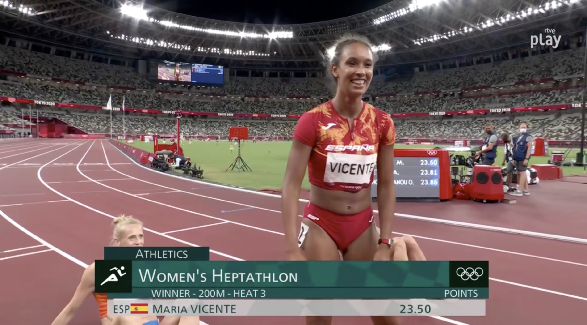 Buen primer día de María Vicente, que pese a no estar en puestos de diplomas olímpico, logra una buena remontada en la última prueba del día gracias a su victoria en los 200 metros, lo que le permite subir de la 21ª posición a la 12ª posición. Con solo 20 años, disputa sus primeros Juegos Olímpicos con gran margen de mejora. Estos han sido sus resultados en las primeras cuatro pruebas: