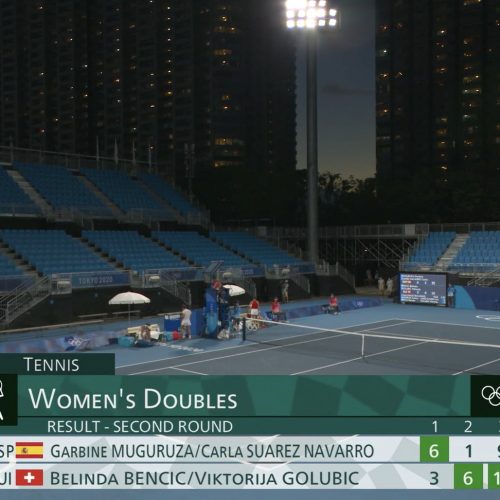 La despedida de las primeras pone fin a la participación olímpica de Carla Suárez, que dice adiós esta temporada al circuito, al que regresó tras unos meses dedicados a tratarse un linfoma. Muguruza y Suárez perdieron ante las suizas Belinda Bencic y Viktorija Golubic por 3-6, 6-1 y 11-9. Tras hacerse con el primer parcial por 6-3 en 38 minutos sin verse nunca amenazadas, Muguruza y Suárez cedieron su primer servicio en la segunda manga. Bencic aumentó su agresividad en la red y Golunbic se hizo la dueña de los pasillos y desarbolaron la compenetración de las españolas.