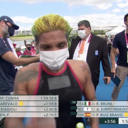 El mejor resultado logrado hasta ahora por Cunha era la quinta plaza en Pekín 2008, cuando tenía 16 años. No se clasificó para Londres 2012 y en los Juegos de Río ocupó la décima plaza. La lucha en cabeza rompió la carrera por detrás y desfondó a algunas de las aspirantes, entre ellas la española Paula Ruiz, que además nadó desde el primer tercio de la prueba con una tarjeta amarilla de amonestación. La china Xin Xin, campeona del mundo, cuarta en Río y que se impuso en la prueba clasificatoria para los Juegos, llegó a estar tercera pero acabó octava tras dar sus siete vueltas al trazado de Odaiba, coincidiendo con la primera bajamar del día.