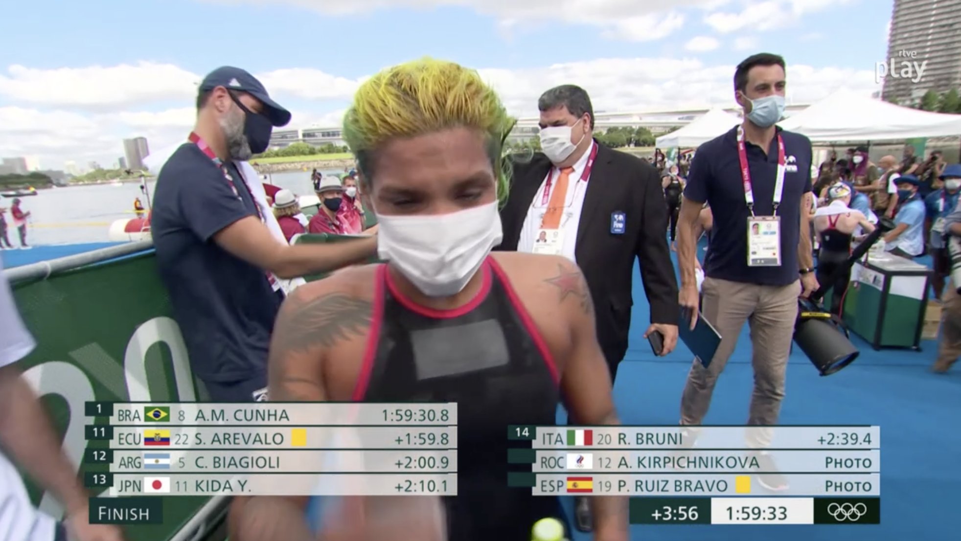 El mejor resultado logrado hasta ahora por Cunha era la quinta plaza en Pekín 2008, cuando tenía 16 años. No se clasificó para Londres 2012 y en los Juegos de Río ocupó la décima plaza. La lucha en cabeza rompió la carrera por detrás y desfondó a algunas de las aspirantes, entre ellas la española Paula Ruiz, que además nadó desde el primer tercio de la prueba con una tarjeta amarilla de amonestación. La china Xin Xin, campeona del mundo, cuarta en Río y que se impuso en la prueba clasificatoria para los Juegos, llegó a estar tercera pero acabó octava tras dar sus siete vueltas al trazado de Odaiba, coincidiendo con la primera bajamar del día.
